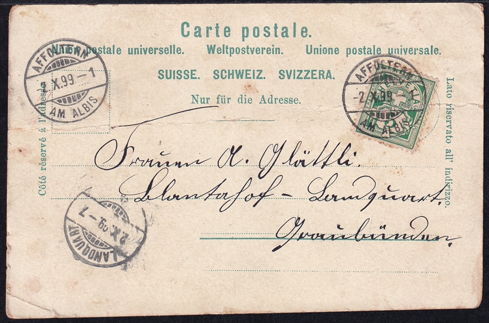 Lithokarten 1899 – „Gruss aus Affoltern a/A“, 4 Bilder, gestempelt, Mängel